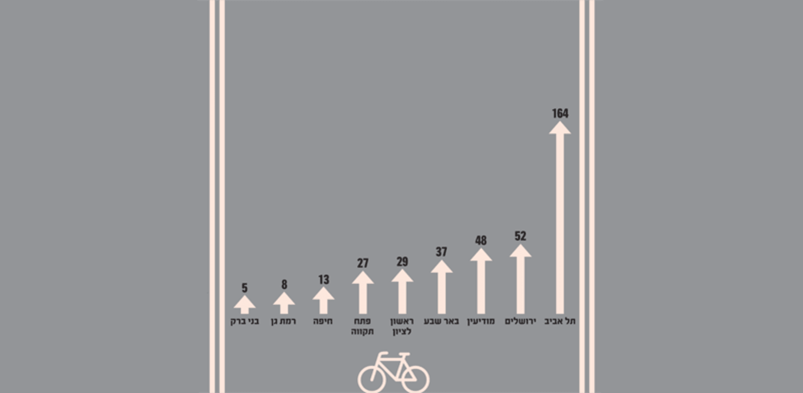 לעומתה, תל אביב שמה את ההתניידות ללא רכב פרטי בראש סדר העדיפויות שלה. מבחינת שטח שיפוט, תל אביב קטנה ביותר מחצי מירושלים ומבאר שבע, ובערך בגודל של מודיעין, ראשון לציון וחיפה. אך בכל זאת, מבחינת שבילי אופניים - כמעט מחצית מהם מרוכזים בתל אביב.