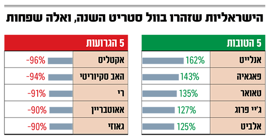 השנה שמסתיימת בקרוב היא השלישית ברציפות של עליות בשיעור דו-ספרתי בוול סטריט. אל החגיגה הצטרפו גם חלק מהמניות הישראליות (או בעלות זיקה לישראל) שנסחרות בארה"ב. עם זאת, היו גם רבות שהציגו ביצועים חלשים במיוחד, בניגוד למגמה הכללית.