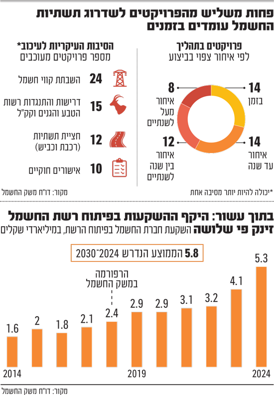 אלא שבמשך שנים רבות, רשת החשמל הוזנחה. ההשקעה בפיתוח שלה (הולכה וחלוקה יחד) נעה בין 1-2 מיליארד שקל בשנה בלבד. זאת לעומת כ־5.8 מיליארד שקל שנדרשים בשנה בממוצע במסגרת תוכנית הפיתוח שנועדה להדביק את הפער. נקודת המפנה הגיעה ב־2018, עם רפורמה גדולה במשק החשמל: חברת החשמל הפסיקה להקים יכולות ייצור חדשות ומכרה חלק ניכר מתחנות הכוח שלה. במקום זאת, הקשב הניהולי הופנה לפיתוח הרשת. כתוצאה מכך, ההשקעה השנתית זינקה בהדרגה והגיעה ל־5.3 מיליארד שקל בשנת 2024 - סכום גבוה משמעותית, אך עדיין לא מספיק כדי ליישם את התוכניות בקצב הנדרש.