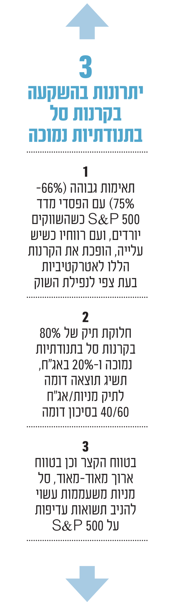 מאחר שקרנות תנודתיות נמוכה מרככות, בממוצע, את ההפסדים והרווחים משוק המניות, "זה מאפשר לחדש את הסיכון במקום אחר", אומר בריאן ג'ייקובס, מנהל תיקים ב־Aptus Capital , חברת השקעות בפיירהופ, אלבמה, המנהלת נכסים בשווי של כ-14 מיליארד דולר. לדבריו, עם 80% בקרנות סל בעלות תנודתיות נמוכה ו־20% באג"ח, תוכלו להשיג תוצאה דומה לתיק מניות/אג"ח 40/60 בסיכון דומה.