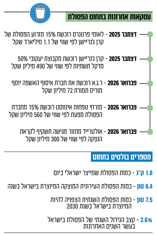 גם בבנק לאומי לא נותרו אדישים לצמיחה בענף הפסולת. בסוף שנת 2025 השקיעה לאומי פרטנרס, זרוע ההשקעות האקטיבית של בנק לאומי, 171 מיליון שקל ב-15% ממניות זרוע עסקי הפסולת החדשה של חברת בלוג'ן (שבשליטת קרן ג'נריישן הציבורית) לפי שווי של כ-1.1 מיליארד שקל לפני הכסף.