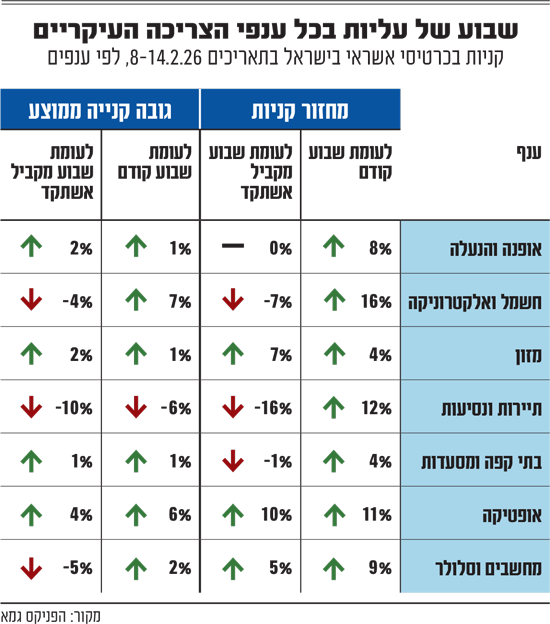 השבוע שבו חל הוולנטיינ'ס דיי התאפיין בעליות בכל מחזורי הקניות בענפי הצריכה המרכזיים, בהשוואה לשבוע הקודם - כך עולה מנתוני מדד הפניקס גמא, הבוחן את פעילות כרטיסי האשראי והתנהגות הצרכנים בענפי הקמעונאות בישראל.