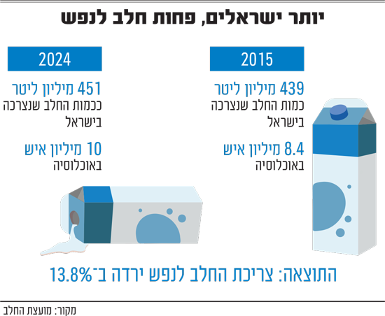 למרות שהחלב הניגר נותר המק"ט (מוצר בודד) הנמכר ביותר ברשתות השיווק, מעמדו האסטרטגי בסל הקניות הישראלי הולך ונשחק. מבט על נתוני העשור האחרון חושף פער דרמטי: ב־2015 צרכו הישראלים 439 מיליון ליטר חלב מפוסטר, נתון שטיפס עד ל־451 מיליון ליטר בלבד ב־2024 - עלייה צנועה של 2.6%. אלא שבתקופה זו האוכלוסייה בישראל רשמה זינוק משמעותי, מ־8.4 מיליון נפש לכמעט 10 מיליון איש. בחישוב לנפש, צריכת החלב למעשה ירדה ב־13.8%. הנתונים הללו מבהירים כי המוצר שנחשב בעבר לעוגן בסיסי בכל מקרר ביתי, הופך להרבה פחות מובן מאליו בתפריט הישראלי הנוכחי.