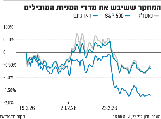 התנודות בשוק ביום שני המשיכו רצף של תנודתיות שקשורה לבינה מלאכותית. בפוסט החדש של סיטריני - חברת מחקר קטנה שצברה קהל עוקבים עצום בפלטפורמת הניוזלטרים Substack בזכות ניתוחי מאקרו ומחקרים תמטיים על שוק המניות - נכתב כי חברות תוכנה, מעבדי תשלומים וחברות אחרות יצרו "שרשרת אחת ארוכה של הימורים מתואמים על צמיחת פריון צווארון לבן", שהבינה המלאכותית עומדת לשבש.