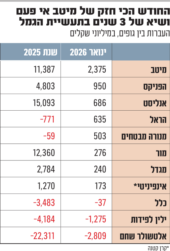 במקום השני בין המגייסים בגמל בינואר השנה ובפער גדול, נמצאת חברת הביטוח הפניקס, עם העברה חודשית נאה ממתחרים של 950 מיליון שקל. בשנה שעברה גייסה הפניקס 4.8 מיליארד שקל, כשסיימה את 2025 במקום השלישי בטבלת התשואות במסלול הכללי של קרנות ההשתלמות (לאחר כלל ומנורה).