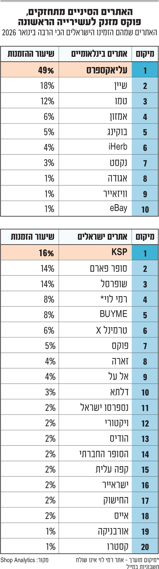 ההזמנות מהאתרים הבינלאומיים רשמו בינואר גידול של 9% לעומת החודש קודם, כאשר מרבית האתרים רושמים גידול גם ביחס לתקופה המקבילה אשתקד. השלישייה הסינית - עליאקספרס, שיין וטמו - מתחזקת מעט, והחודש מרכזת יחד כ-80% מההזמנות באתרים הבינלאומיים. עליאקספרס וטמו עלו בכ-15% לעומת החודש הקודם, ואילו שיין רשם גידול של 30%.