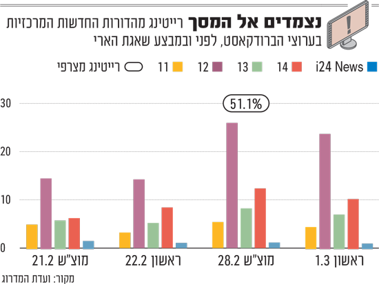 בפועל, ערוץ קשת 12 הוא היחיד שעלה בצורה דרמטית, בעוד המתחרים לא הצליחו לתרגם את המצב לעלייה משמעותית יותר ברייטינג. הנתונים מהווים שיקוף למצב שהתקבע בשוק הטלוויזיה: קשת שומרת על המקום הראשון המובהק, ערוץ 14 מתבסס במקום השני, ורשת 13 עומדת במקום השלישי (מה שמעורר סערות בין הנהלת הערוץ לבין חברת החדשות שלו, בצל העסקה מול בעלי HOT ו-i24NEWS פטריק דרהי).